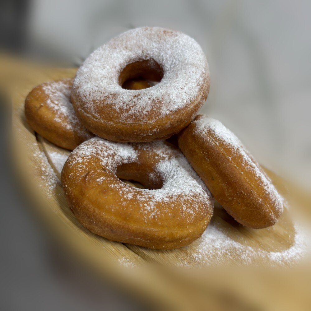 Пончики из теста, обжаренные во фритюре и посыпанные сахарной пудрой. 150гр